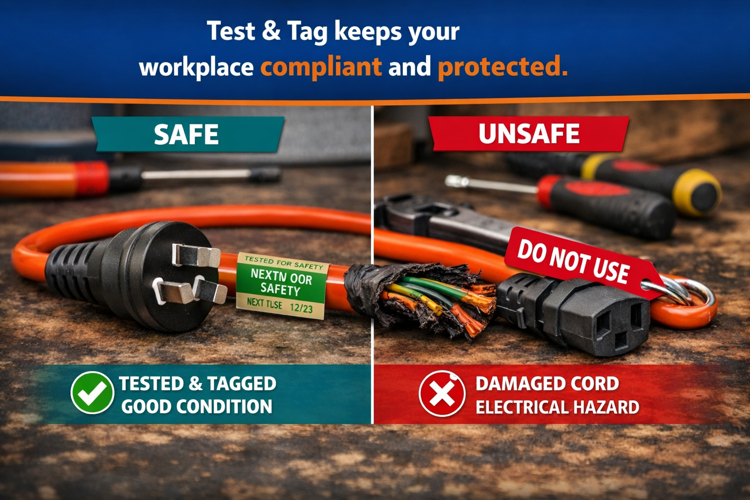 Regular test and tagging of electrical equipment are essential for maintaining a safe workplace and meeting your responsibilities under Australian WHS legislation. By inspecting and testing portable appliances in line with AS/NZS 3760:2022, hidden faults can be identified before they lead to electric shock, fire, or equipment failure. Clear, compliant tagging also provides visible proof of due diligence during audits, inspections, and incident investigations — helping your business stay safe, compliant, and confident.